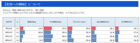 美容への興味について聞いた質問では、若い世代ほど「興味がある」の割合が高い結果となりました。「やや興味がある」も含めると、20代・30代男性は半数以上が美容に興味をもっているようです。