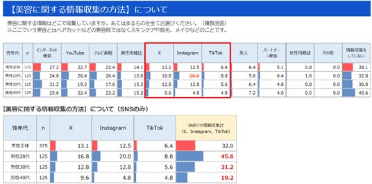 【SNSからの美容情報収集 20代男性は45.6% 40代男性の2倍以上の割合】