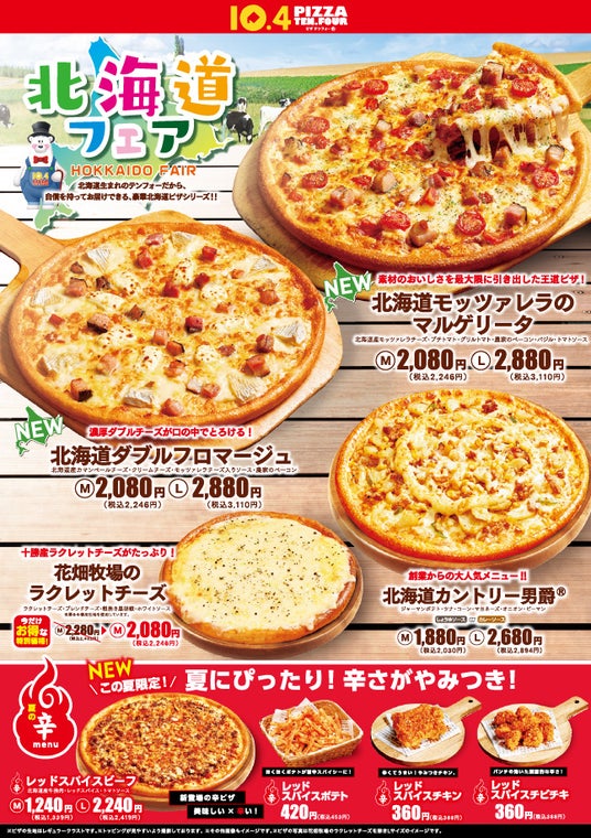 北海道生まれの宅配ピザチェーン10.4( テンフォー)を運営する、株式会社テンフォー(本社・北海道函館市/代表・高橋仁志)は、北海道産モッツァレラチーズと旨味が凝縮されたベーコンを使用した『北海道モッツァレラのマルゲリータ』と濃厚でクリーミーな2種のチーズが特徴の『北海道ダブルフロマージュ』を2024年8月1日(木)に発売いたします。また、暑い夏にぴったりな辛旨特製スパイスを使用した『レッドスパイスシリーズ』も期間限定で同時発売いたします。
