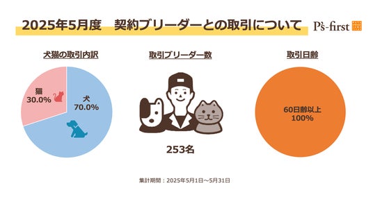 P’s-first直営店では、オークションなどの第三者を経由せず、全国の信頼できる契約ブリーダーからペットを直接取引しています。2025年5月1日から5月31日までにペッツファーストグループが取り扱ったペット、すなわち契約ブリーダーから引き受けたペットの頭数が1,932頭、そのうち犬が70.0%、猫が30.0%です。なお、5月度に引き受けたペットたちは253名の契約ブリーダーと取引いたしました。