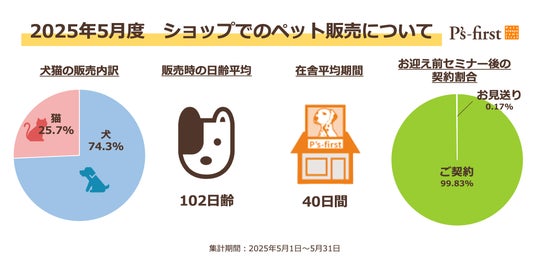 Pʼs-first直営店での5月の販売頭数は1,727頭、内訳は犬が74.3%、猫が25.7%でした。販売時点での日齢平均は生後102日齢、店舗に在舎を始めお客様に迎えられるまでの平均期間は40日間でした。
