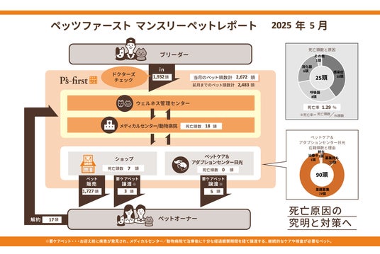 “Pets always come first”を理念に掲げるペッツファーストホールディングス株式会社(本社:東京都目⿊区、社長︓正宗 伸麻)は、ペットショップ「Pʼs-first」直営店の 2025年5月度における流通過程の重要指標をご報告いたします。