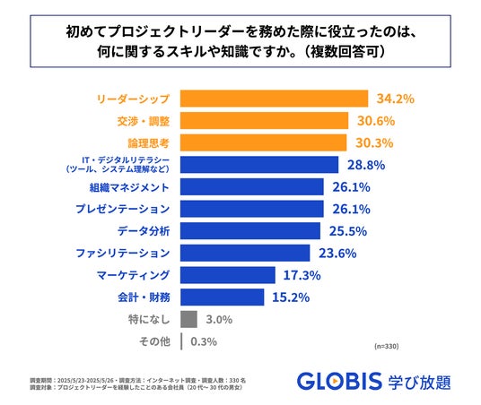 なお、初めてプロジェクトリーダーを務める際に重要なスキルとして、「リーダーシップ」や「交渉・調整」「論理思考」「組織マネジメント力」が挙げられました。これらは多くの人にとって実際に役立っただけでなく、事前に身につけておくべきと感じられる必須スキルであることがわかりました。