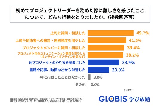 さらに、「初めてプロジェクトリーダーを務めた際に難しさを感じたことについて、どんな行動をとったか」を尋ねたところ、1位が「上司に質問・相談した」で49.7%、2位が「上司や関係者への報告・連携頻度を増やした」で41.5%、3位が「プロジェクトメンバーに質問・相談した」で39.4%という結果でした。また、「プロジェクト内のコミュニケーション頻度を増やした」も、38.2%と僅差で4位となりました。ここから、初めてプロジェクトリーダーを務めた際に直面した難しさに対して、多くの人が、上司や関係者・プロジェクトメンバーとの連携により解決を試みていることがわかりました(図4)。
