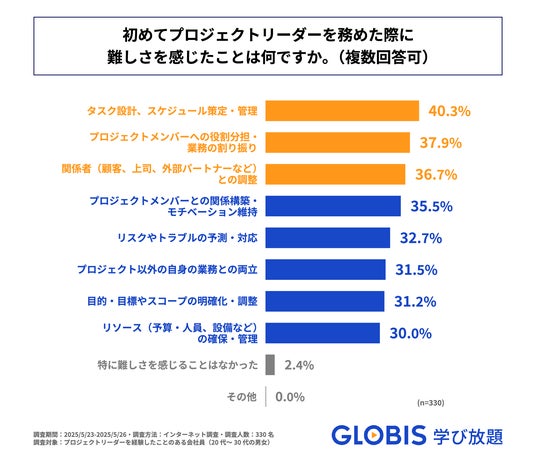 株式会社グロービス(東京都千代田区、代表取締役:堀 義人)が提供する定額制動画学習サービス「GLOBIS 学び放題」は、プロジェクトリーダーを経験したことのある20代~30代の会社員を対象に「初めてプロジェクトリーダーを務めた際の難しさ」に関する実態調査を実施しました。