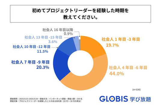「初めてプロジェクトリーダーを経験した時期」を尋ねる設問への回答で多かったのは、1位が「社会人4年目-6年目」で44.0%、次いで2位が「社会人7年目-9年目」で20.3%、3位が「社会人1年目-3年目」で19.7%となりました。この結果から、6割以上が社会人6年目までにプロジェクトリーダーを経験していることが明らかになりました(図1)。
