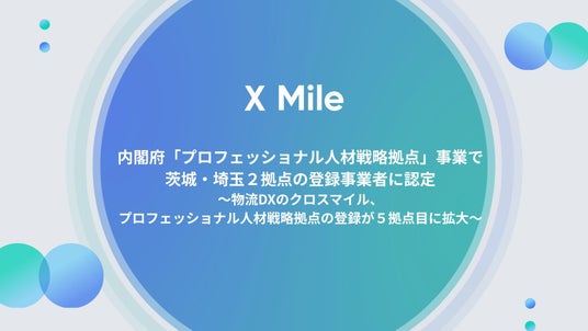 ノンデスク産業に特化したHRプラットフォーム「クロスワーク」を展開するX Mile株式会社(クロスマイル、本社:東京都新宿区、代表取締役:野呂 寛之、以下「当社」)は、この度、内閣府が推進する「プロフェッショナル人材戦略拠点」事業において、新たに2拠点(茨城県・埼玉県)の登録民間人材ビジネス事業者に認定されましたことをお知らせいたします。