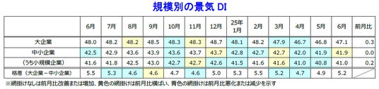 「中小企業」(41.9)…同横ばい。ドライバーの就労時間の短縮や人件費の上昇などを受けて『運輸・倉庫』が低調だった。他方、コメ価格の高止まりや鶏卵相場の上昇などにより『農・林・水産』は過去最高を更新した。