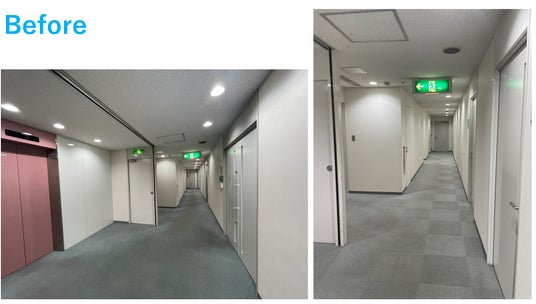 4階のエレベーター前や通路、トイレといった共用部のリニューアル工事を行いました。