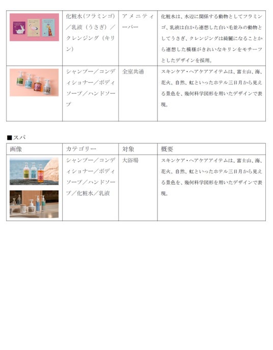 歯に関係する動物で大人用とお子様用を分けたデザインの歯ブラシ類や、毛に関係する動物でデザインしたブラシ類、それぞれ水辺に関係する動物と白い毛並みの動物がモチーフの化粧水と乳液など、目的や機能と動物のイメージを連想しながら楽しむことができます。スキンケア・ヘアケアアイテムは、富士山、海、花火、自然、虹といったホテル三日月から見える景色を、幾何科学図形を用いてデザインすることで、楽しいホテルステイを演出します。