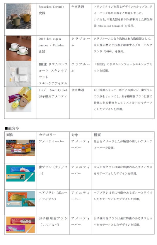 「富士見亭」では“資源循環型ホテル”を目指す「サステナブルリゾート化計画」の一環としてアメニティを全面的に見直し、オーガニックをテーマにしたサステナブル仕様へと刷新。上質なスパリゾートホテルとしてのブランドイメージへ転換を図るとともに、宿泊単価に見合ったハイクオリティなアメニティに一新しました。「龍宮亭」では“エンターテインメントホテル”と位置付け、親子で楽しめるデザインへのリニューアルを行うとともに、体験型のアメニティバーを新たに導入します。