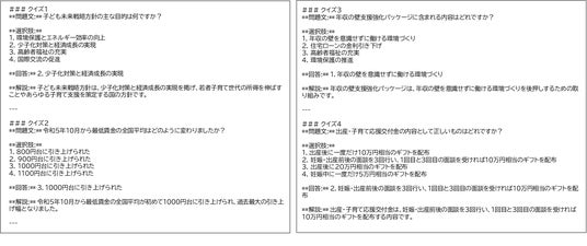 出力例:政府広報オンライン 【こども未来戦略方針】子育て世帯の家計を応援 対談動画を基にクイズを作成 https://www.gov-online.go.jp/prg/prg27481.html
