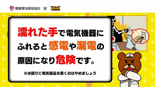 動画冒頭、吉田くんと総統が日常に潜む「感電」の危険性を二択のクイズ形式で体を張って分かりやすく紹介し、終盤では協会の作業服を着た吉田くんと総統が電気安全を呼びかけ、最後は吉田くんが歌うサウンドロゴで締めくくります。
