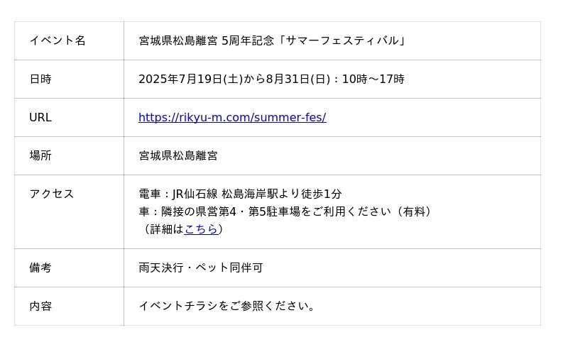 日本三景 松島にある観光複合施設「宮城県松島離宮」(運営:丸山株式会社)では、7月19日(土)より、開業5周年を迎えるにあたり「サマーフェスティバル」を開催します。