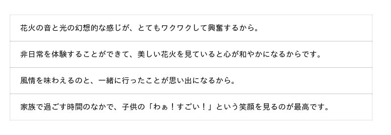 花火大会が好きな理由として、美しさや特別感、思い出に残ることを挙げる人が多くいました。