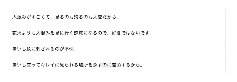 花火大会が好きではない理由として、人混みや暑さなど環境への不満を挙げる人が目立ちました。