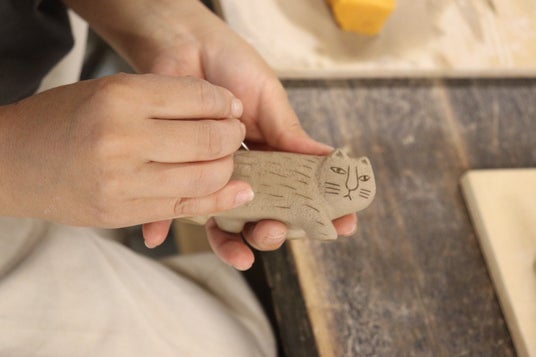 丹波野良猫には、陶磁器の装飾方法の一つである「鎬(しのぎ)」の手法を応用した老職を施しています。鎬とは、陶器の表面を削って彫り模様を施す技法で、刀の稜線を思わせる鋭い彫り跡が特徴です。本来はか鉋をつかって絵柄を掘り出すのですが、今回は毛並みを表現するために細い針先を使用しています。