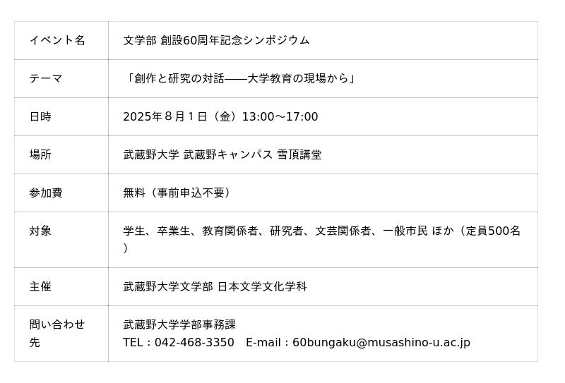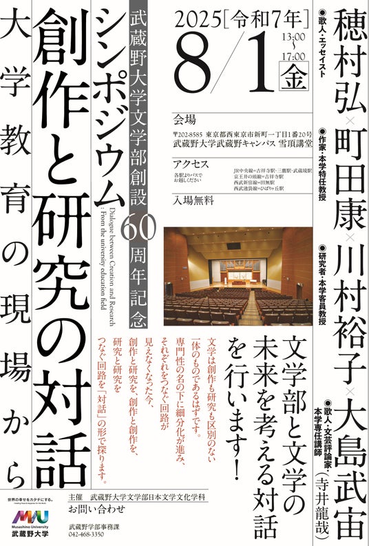 武蔵野大学文学部(東京都西東京市)は、2025年8月1日(金)に創設60周年を記念するシンポジウム「創作と研究の対話――大学教育の現場から」を武蔵野キャンパス雪頂講堂にて開催します。申し込み不要、参加費無料でどなたでもご参加いただけます。