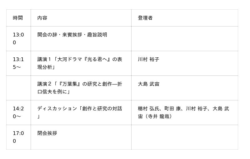 本シンポジウムでは、歌人として著名な穂村 弘氏をはじめ、学外・学内の第一線で活躍する創作家・研究者の町田 康、川村 裕子、大島 武宙が登壇。AI時代の文学研究、古典の二次創作の可能性、創作の未来、など多岐にわたるテーマの講演やディスカッションを通して学部創設以来の伝統である「創作」と「研究」の融合的な教育実践に焦点を当て、文学の未来について考える契機とします。また、本学文学部が日本文学文化の分野において独自の教育的特徴を持ち、創作と研究を統合した希少な学びの場であることを社会に広く発信する機会とします。