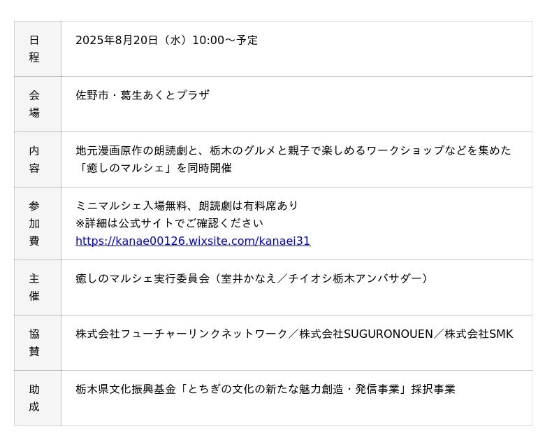 本プロジェクトは、「チイオシ栃木」アンバサダーである室井かなえ氏が主宰する「栃木の癒しのマルシェ」を母体とし、地元漫画『負けるな!ギョーザランド!』を原作にした朗読劇とマルシェを組み合わせたユニークな地域共創型イベントです。2024年に初開催され、好評を博したことを受け、今年は2025年8月20日(水)に第2回目の公演を実施いたします。