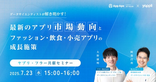 アプリ市場分析サービス「App Ape(アップ・エイプ)」を提供するフラー株式会社(本社:新潟県新潟市、代表取締役社長:山崎将司、以下「フラー」)と、アプリプラットフォーム「Yappli(ヤプリ)」を提供する株式会社ヤプリ(本社:東京都港区、代表取締役:庵原保文、以下「ヤプリ」)は、2025年7月23日(水)に共催オンラインセミナー「データサイエンティストが解き明かす!最新のアプリ市場動向とファッション・飲食・小売アプリの成長施策」を開催します。