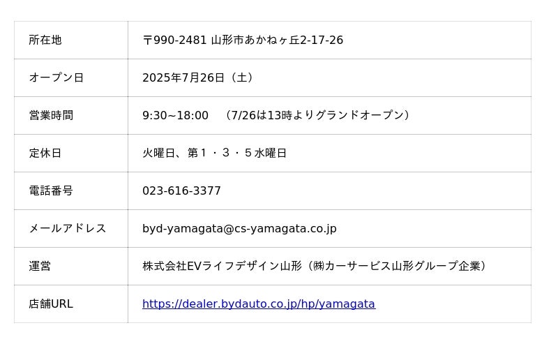 BYDの日本法人であるBYD Auto Japan株式会社(本社:神奈川県横浜市、代表取締役社長:東福寺 厚樹、略称:BAJ)の正規ディーラーである株式会社EVライフデザイン山形(本社:山形県山形市、代表取締役社長:小川 大輔)は、2025年7月26日(土)に、全国で43店舗目、山形県初となるショールームを備えた正規ディーラー店舗「BYD AUTO 山形」(https://dealer.bydauto.co.jp/hp/yamagata)をオープンします。
