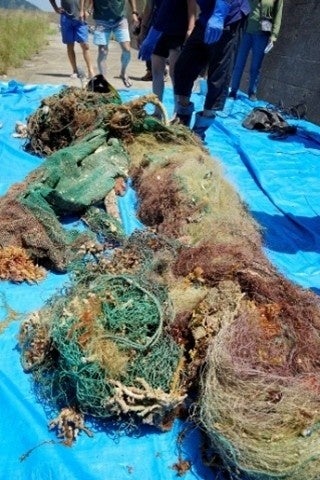 今回の五島での作業は初めての大型ゴーストギアの回収で、プロセスのノウハウを学んだ貴重な経験でした。複数の網が絡み合ってゴーストギアが大型化したプロセスも垣間見え、今後の分解作業の中で、ゴーストギアの実態についても多くの知見が得られそうです。一方で、持ち主不明の大型ゴーストギアの回収は、費用や手間、関係者調整など、想像以上の苦労がありました。漁業資源や船の航行、海洋生態系等に負の影響を及ぼすゴーストギアへの対策について、行政の後押しが求められることを再確認しました。
