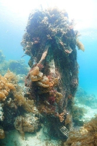 複数の漁網が絡み合って、海藻類が付着し、エビやカニ、サンゴなどが引っかかっている