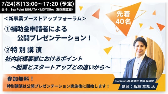 新潟市外郭団体の(公財)新潟市産業振興財団では、新事業ブーストアップ補助金の申請者による公開プレゼンテーション審査会と「社内新規事業におけるポイント」をテーマとした特別講演を開催いたします。