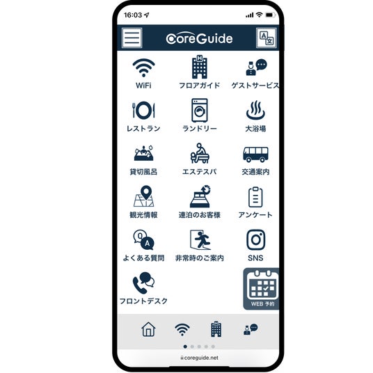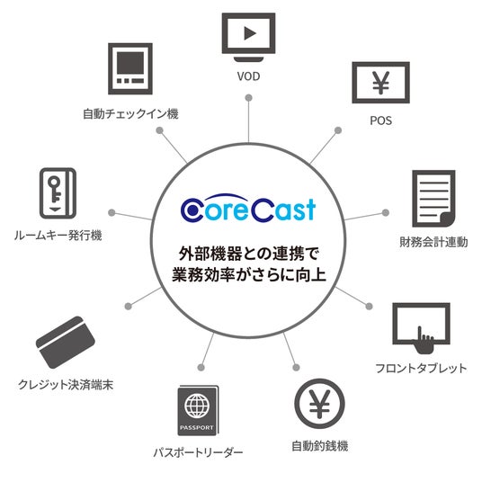 弊社は事業者に向けて1社で総合的なソリューションを提供しております。例えば宿泊施設の予約登録やチェックイン・チェックアウトを統合管理できるPMS『Core Cast』、宿泊客が客室や室内のテレビ、館内に設置されているポップからQRコード※をスマートフォンから読み込むことで浴場やレストランの混雑状況、コインランドリーの利用状況が閲覧可能となる『Core Guide』といったシステムを提供しております。