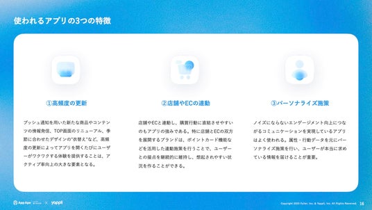 「高頻度のアプリ更新」「店舗やECの連動」「パーソナライズ施策」は、使われ続けているアプリに共通して見られる特徴として示されています。