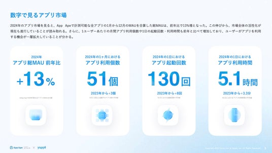 2024年のアプリ総MAUは前年比+13%となり、1人あたりの月間利用アプリ数は平均51個、1日の平均利用時間は5.1時間と増加傾向にあります。