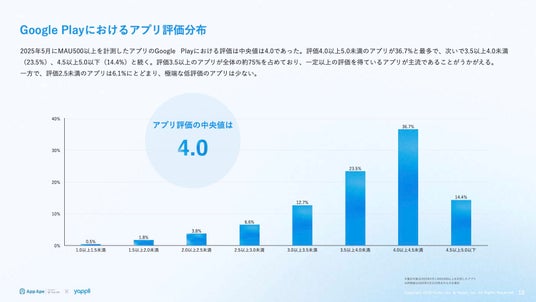 一方で、評価2.5未満のアプリは6.1%で、極端に低い評価のアプリは少数にとどまっています。
