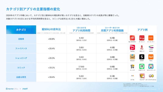 特にMAUの伸びが大きかったアプリカテゴリは「自動車(+60.8%)」や「ファイナンス(+20.4%)」「ショッピング(+20.3%)」でした。
