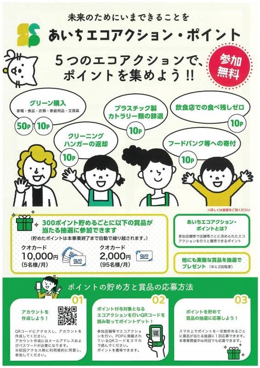 QRコードをスマホで読み取るとあいちエコアクション・ポイントを獲得でき、ポイントを貯めるごとに抽選で賞品がもらえるものです。