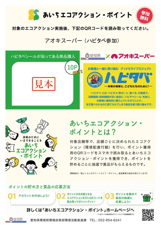 この連携は、株式会社アオキスーパーの店舗で本日スタートしており、ハピタベの参加を通じて賞品が抽選でもらえる「エコアクション・ポイント」が獲得できる仕組みです。