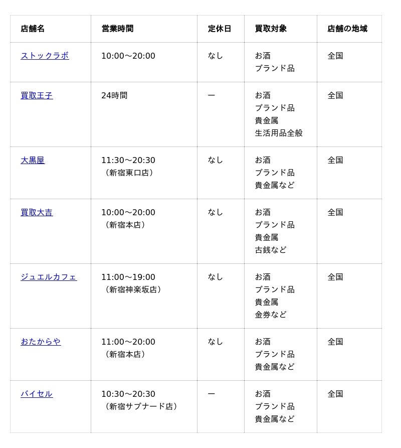 ではさっそく、宮城峡買取におすすめの業者を7選ご紹介しましょう、まずは、今回紹介する業者名と買取時の主要情報をまとめた一覧表からご確認ください。