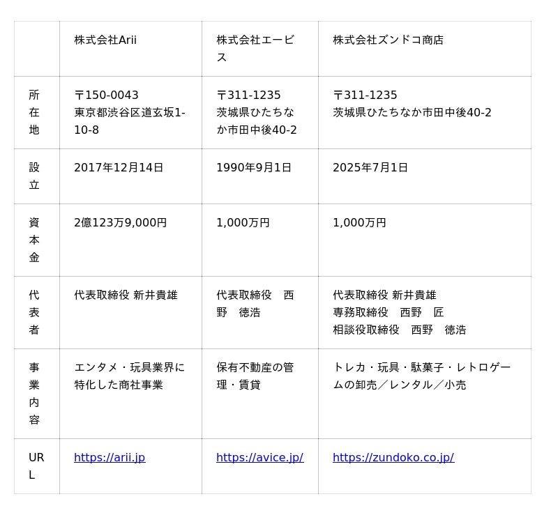 エンターテインメント業界に特化した総合商社 株式会社Arii(本社:東京都渋谷区、代表取締役:新井貴雄、以下「Arii」)は、株式会社エービス(本社:茨城県ひたちなか市、代表取締役:西野 徳浩、以下「エービス」)より株式会社ズンドコ商店の全株式を承継する契約を締結しましたのでお知らせいたします。ズンドコ商店は、株式会社エービスからトレーディングカード、玩具、駄菓子、レトロゲームの卸売・レンタル・小売事業を新設分割によって承継した会社です。今後Ariiグループの一員として、ズンドコ商店が培ってきた店舗運営・仕入れネットワークを生かし、全国のホビー/レジャー市場に新たな価値を提供してまいります。