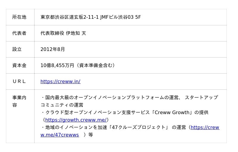 Crewwは、「大挑戦時代をつくる。」をビジョンに掲げ、スタートアップ、起業家、事業会社、個人を問わず、挑戦したいすべての人のトータルサポート企業として、それぞれのニーズにマッチしたさまざまなサービスを提供しています。約8,500社のスタートアップが登録するオープンイノベーションプラットフォームを運営し、国内・海外において500回以上のオープンイノベーションプログラムの開催、約1,500件の協業を実現しています。
