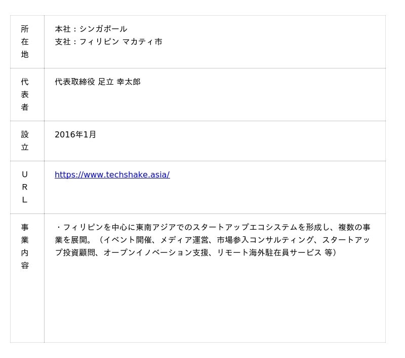 TechShakeは、「フィリピンを中心とした東南アジアのスタートアップエコシステムの拡大と東南アジアと世界をつないでいくこと」をビジョンに掲げ、東南アジアでのスタートアップエコシステムを形成しています。テック企業の進出支援、イノベーションプログラム運営、イノベーションハブ運営(LimineLabs)、ベンチャービルディングプログラム運営(Go Global Catalyst)、イノベーションカンファレンス運営(IGNITE)などの活動を行っています。また、東南アジアアライアンスの、ATLAS、SEA Business Connectの主要パートナー企業として、数多くの海外企業の東南アジア進出の支援をしています。