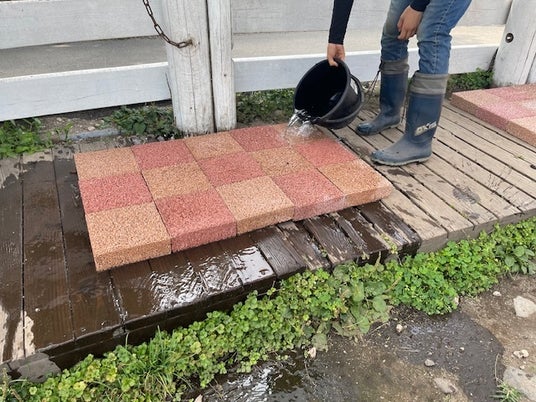 今回、毎年の暑さで動物たちの負担も大きい伊香保グリーン牧場に弊社の水をまくことによって、冷たくなるブロック「打ち水平板」を使ったひんやりスポットを提供します。