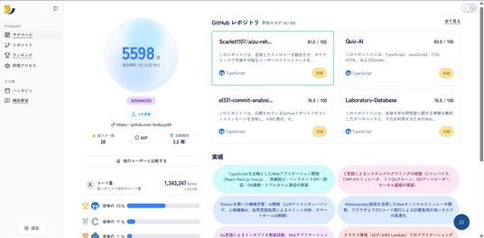 - 技術力の可視化: AIがGitHub上のソースコードを分析し、得意言語やスキルを定量的なスコアでレポート化します。