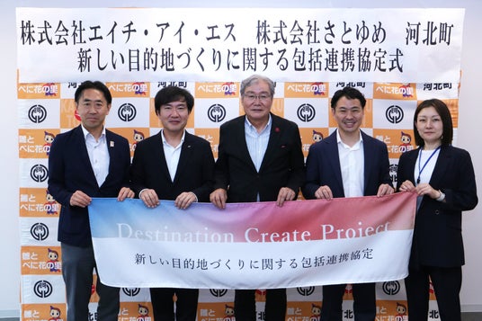 全国50エリア以上で地方創生事業のプロデュースを行う株式会社さとゆめ(本社:東京都千代田区、代表取締役CEO:嶋田 俊平、以下「さとゆめ」)は、株式会社エイチ・アイ・エス(本社:東京都港区、代表取締役社長:矢田 素史、以下「HIS」)と共に、河北町(町長:森谷 俊雄)と「新・目的地創出事業-Destination Create Project-」(以下「DCP」※)に関する包括連携協定を締結しました。