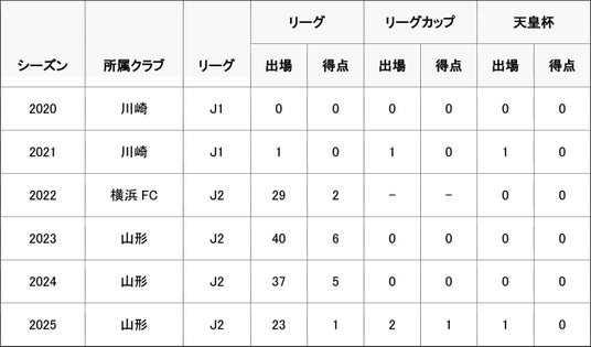 - 天皇杯通算 4試合出場1得点※桐蔭横浜大学在籍時の出場試合も含む