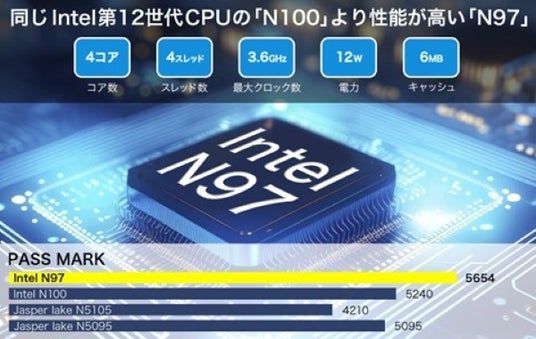 更に、同じIntel第12世代プロセッサ「Alder Lake-N N100、以下(N100)」との比較でも、N100のクロック速度が最大3.4GHzに対し、N97は最大3.6GHzとより高い処理性能を発揮します。