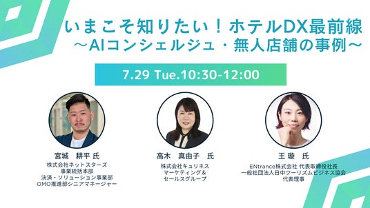 一般社団法人日中ツーリズムビジネス協会が7月29日(火)10:30より開催するウェビナー「いまこそ知りたい!ホテルDX最前線 ~AIコンシェルジュ・無人店舗の事例~」に、株式会社ネットスターズ 事業統括本部 決済・ソリューション事業部OMO推進部 シニアマネージャー 宮城 耕平が登壇します。