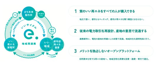 「e.CYCLE(いいサイクル)」は、再エネに関わる自治体、発電所、小売電気事業者、そして電力消費者をつなぐ再エネアグリケーションプラットフォームで、再エネの“地産地消”や、再エネを産地から他地域に売電する“地域間流通”を可能にします。特長は、電力取引で得た収益の一部を「地域活性化原資」として再エネの産地に還元することです。