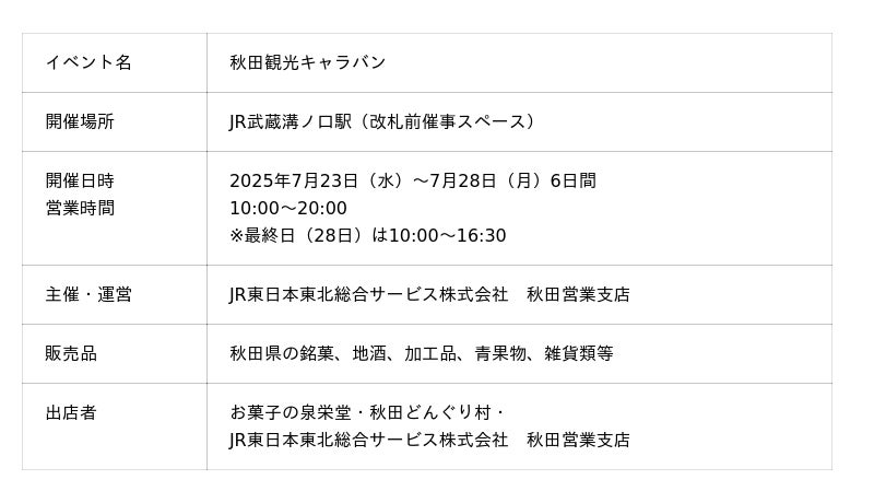 JR東日本東北総合サービス株式会社(本社:宮城県仙台市、代表取締役社長:弭間 俊則)は、JR東日本グループで取り組む「地域再発見プロジェクト」の一環として、秋田県の魅力を首都圏に発信するため「秋田観光キャラバン」を開催します。地産品等の販売や観光PRを通じて、首都圏の皆さまに秋田の魅力を存分にお届けします。JR武蔵溝ノ口駅(旧びゅうプラザ跡地)で皆さまのご来場を心よりお待ちしております。