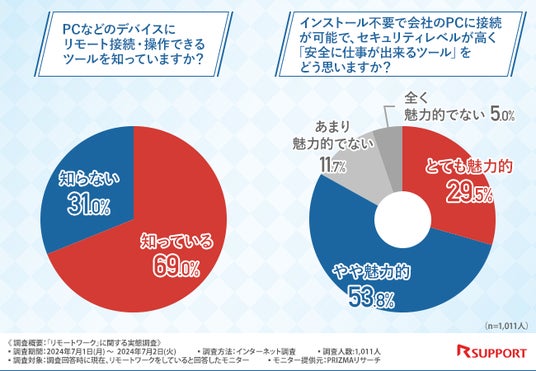 「PCなどのデバイスにリモート接続・操作できるツールを知っていますか?」と質問したところ、『知っている(69.0%)』『知らない(31.0%)』という結果になりました。