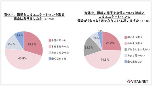 ・同じく、69.8%が「育休中に職場の様子や復帰について職場(上司や人事担当者など)とコミュニケーションの機会が(もっと)あったらよい」と「強く思う・やや思う」と回答。